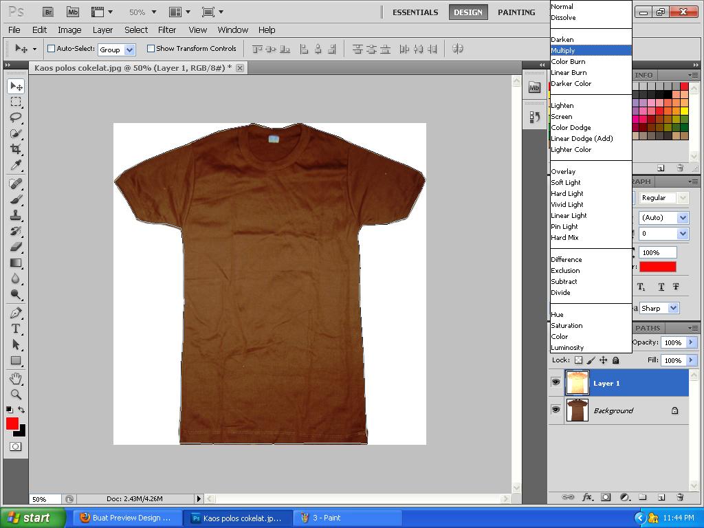 then change the 'blending mode' in 'layer 1' to 'multyply'. this step to make 'layer 1' only show the crease of shirt.